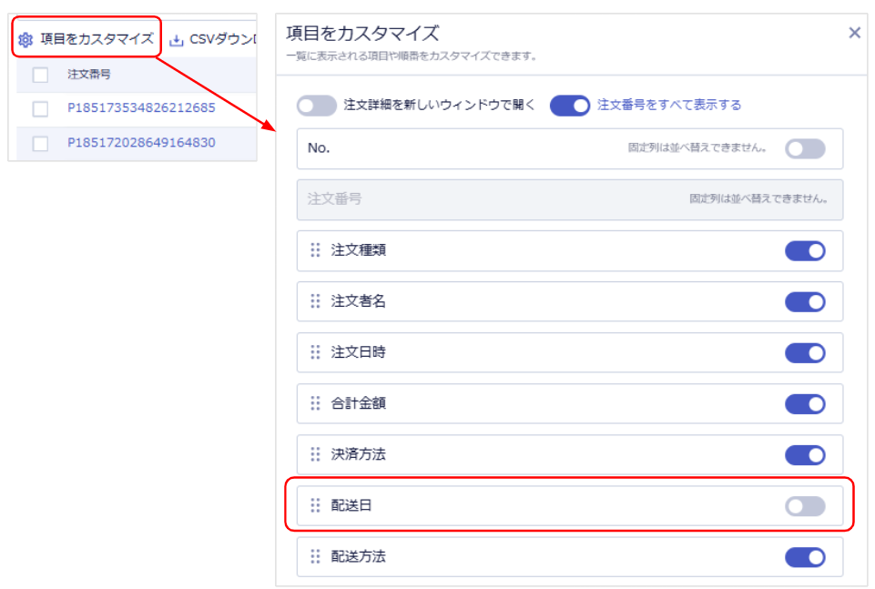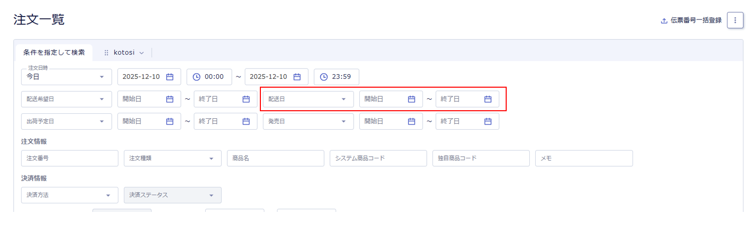 注文一覧の検索項目および表示項目に「配送日」を追加いたしました。