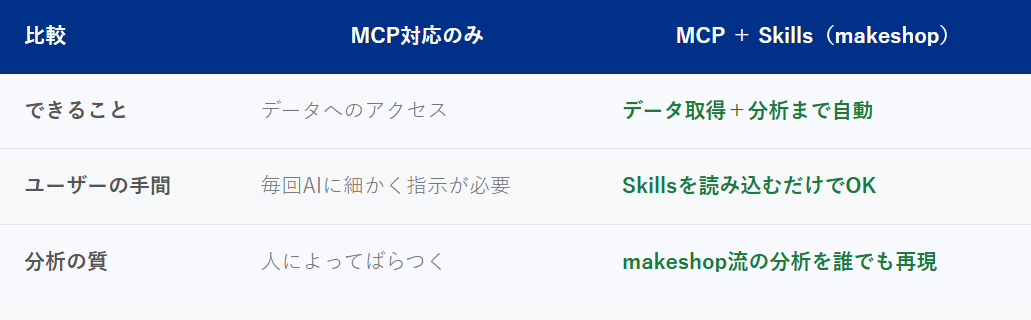 AIエージェントへの「指示書」のことです。MCPでAIとmakeshopがつながっても、AIは「何をどう分析すればいいか」を自分では知りません。Skillsとは、その分析の手順・観点・判断基準をまとめたMarkdownファイル(.md)で、AIに読み込ませることで専門知識ゼロでも高品質な分析が再現できます。