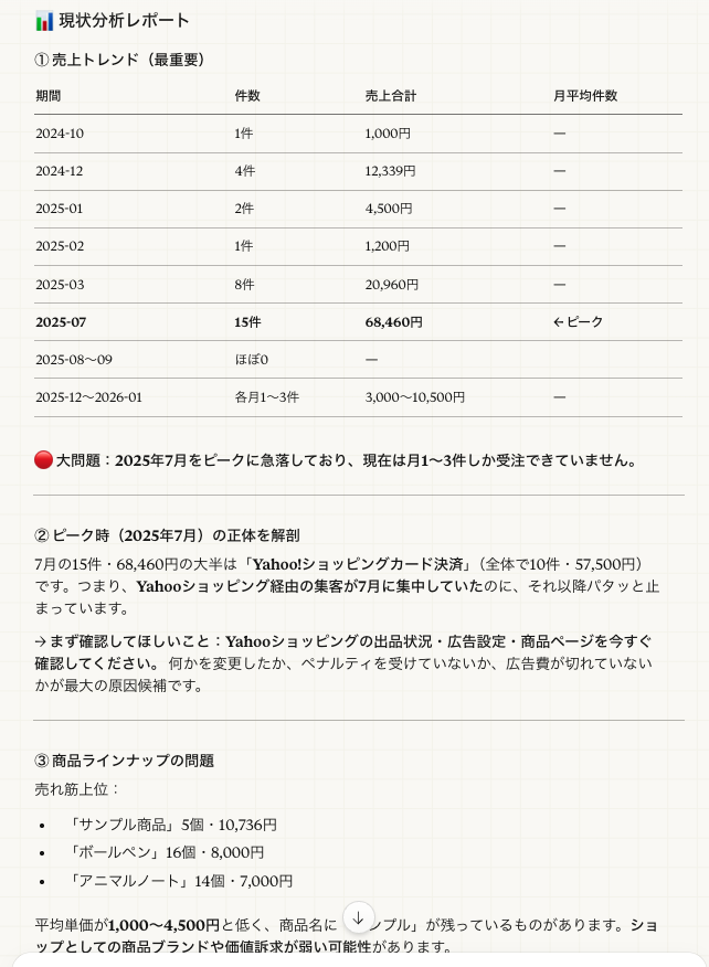 Claudeに話しかけると、makeshopのショップデータを参照し、分析結果をそのまま会話の中で返します。「売上が伸びていない原因を分析して」と話しかけると、AIが注文データをもとに原因を特定し、具体的な改善提案まで返します。これまで時間がかかっていた分析作業を、チャット感覚ですぐに引き出せます。