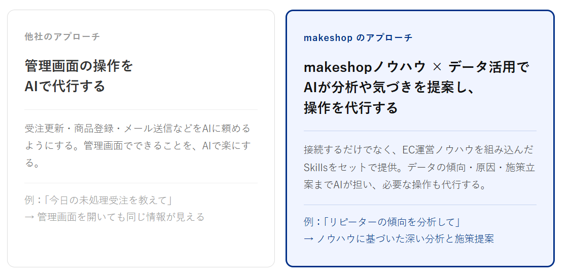 あわせて、makeshopのEC運営ノウハウをAIに組み込むための「Skills」も同時に配布予定です。