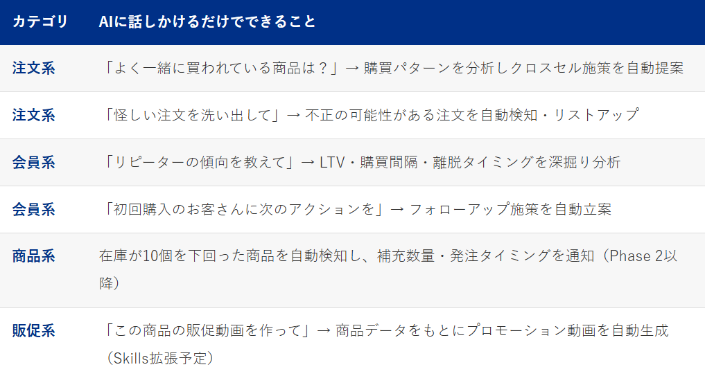 MCPサーバー対応時には、まずは「注文分析」に関するSkillsを配布予定です。