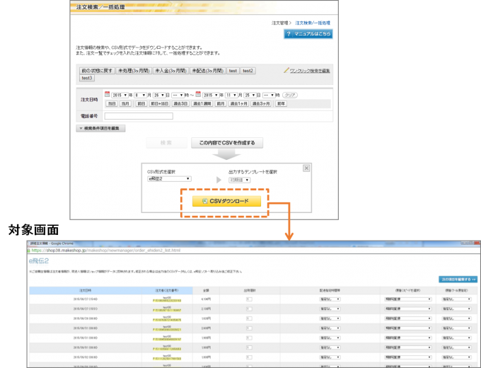 【注文検索/一括処理】のe飛伝2用CSV出力時の画面において不足項目、項目名や項目内容が異なるものがある。