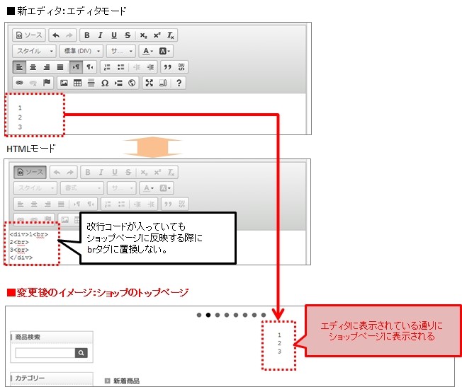 これらのショップ様に対しては、ショップページ上の表示が変わらないように、リリース時点で「トップページデザイン」ソースにおける改行コードは強制的にbrに置換し、挿入させていただきます。