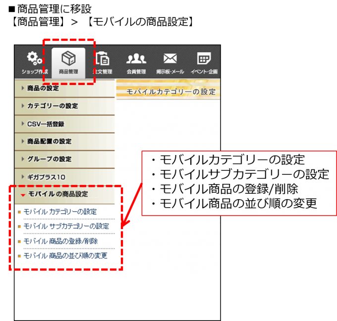 また、今回実施するメニューの整理・統合の影響で、「モバイル(フィーチャーフォン)の設定」はショップ作成・商品管理画面に移設されます。