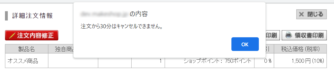 この度、銀行振込・代金引換・任意決済・後払い.com(手動連携)・NP後払い(手動連携)以外の決済において、注文後30分間は「注文キャンセル」「注文キャンセル(在庫戻し)」「ポイント返還」ボタンをクリックしても「キャンセル」処理ができないよう制限いたします。▼表示されるアラート