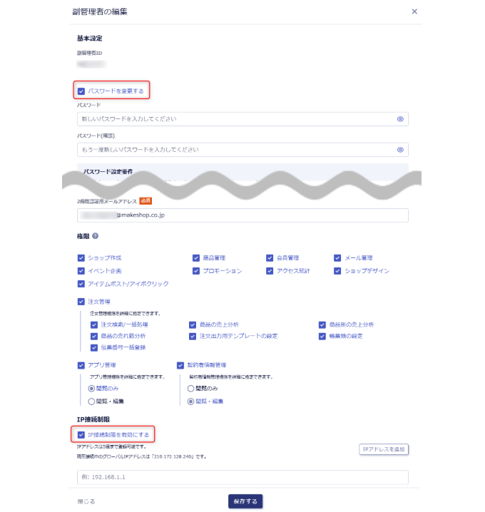 各種権限の詳細は、副管理者IDの権限 をご確認ください。