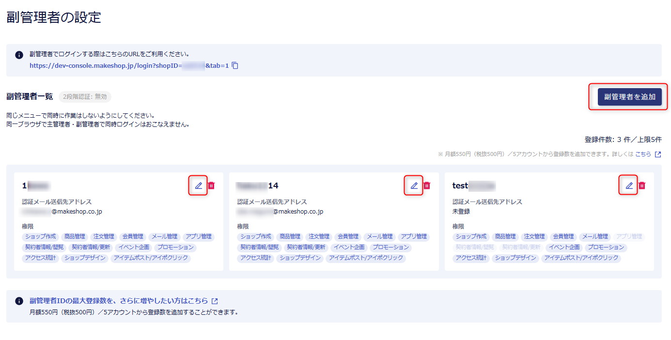 各副管理者IDのペンマークから編集、ごみ箱マークで削除ができます。