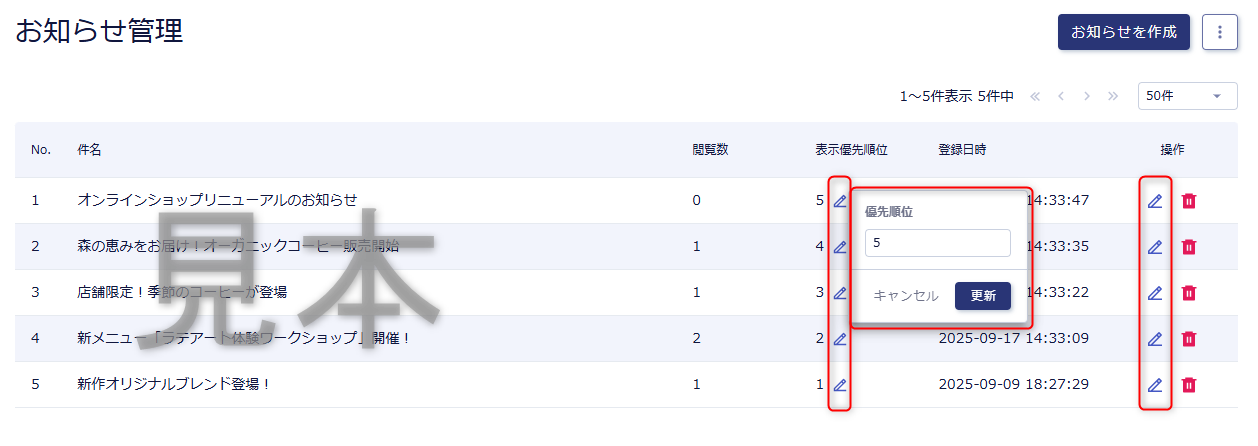 「表示優先順位」の並び替えや「お知らせの編集」がペンマークからできます。