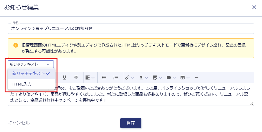 「HTML入力」と「新リッチテキスト」で編集が可能です。
