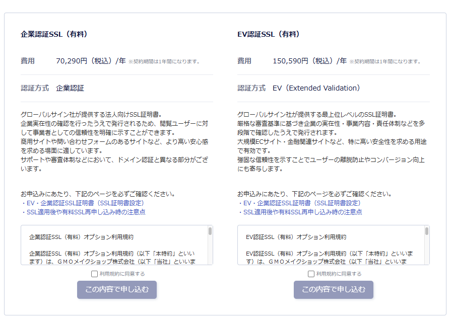 2025/12/11(木)15時以降、GMOグローバルサインが提供する有料SSL証明書として、新たにEV認証SSL・企業認証SSLの2種類にお申し込みいただけるようになりました。