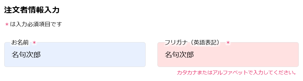 1.『お名前(フリガナ)』欄を「全角カナ」および「英字(全角・半角)」のみに制限いたしました
