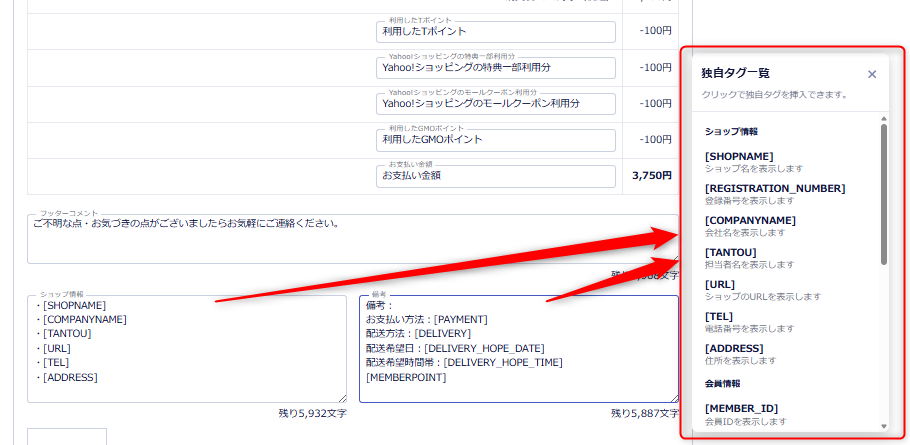 ・コメント欄(ヘッダーコメント・フッターコメント・ショップ情報・備考)