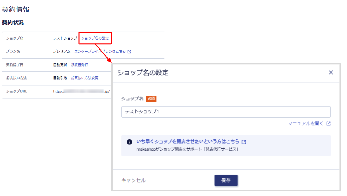 管理画面右上ショップID / 契約情報 / 「ショップ名の設定」