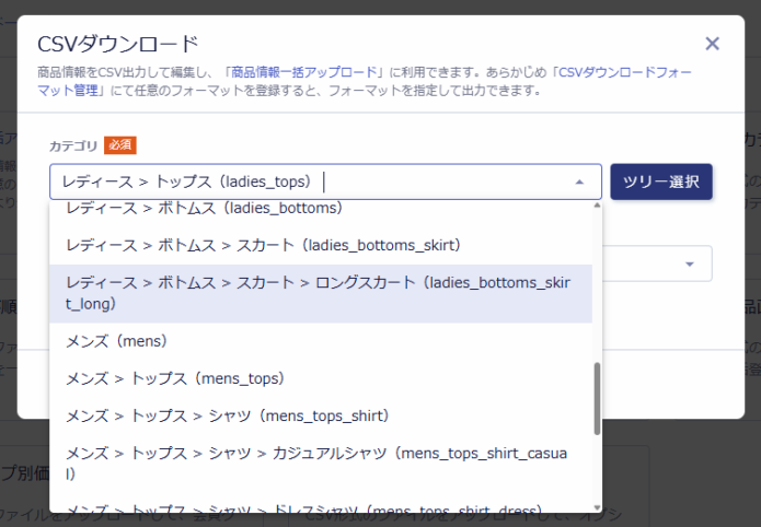これまで商品CSVのダウンロード時には、第1階層のカテゴリまでしか選択できず、特定の子カテゴリに属する商品のみを抽出することはできませんでした。