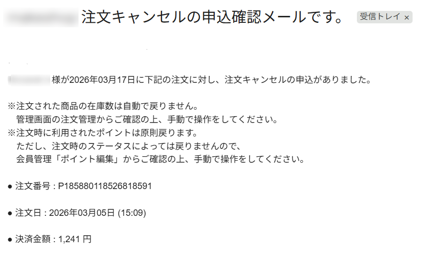 マイページからのキャンセル時、ショップのお問い合わせメールへ自動送信される通知メールの内容について一部修正いたします。