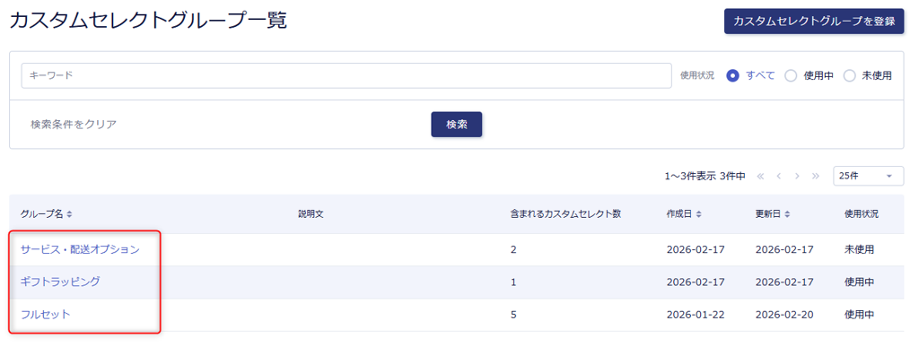 移行した後も「オプショングループ」と商品の紐づけは残りますので、任意のタイミングで「カスタムセレクト」に商品を紐づけて切り替えをおこなえます。