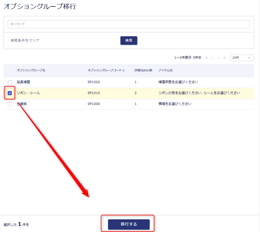 ◎対象画面:商品管理 / 機能・設定 / オプショングループ移行(新設)