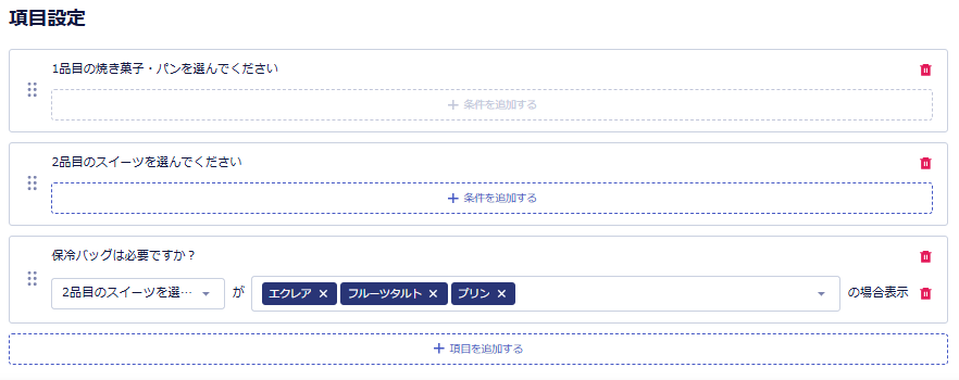 「質問2」で「要冷蔵スイーツ」を選んだ場合のみ ⇒「保冷バッグは必要ですか?」を表示