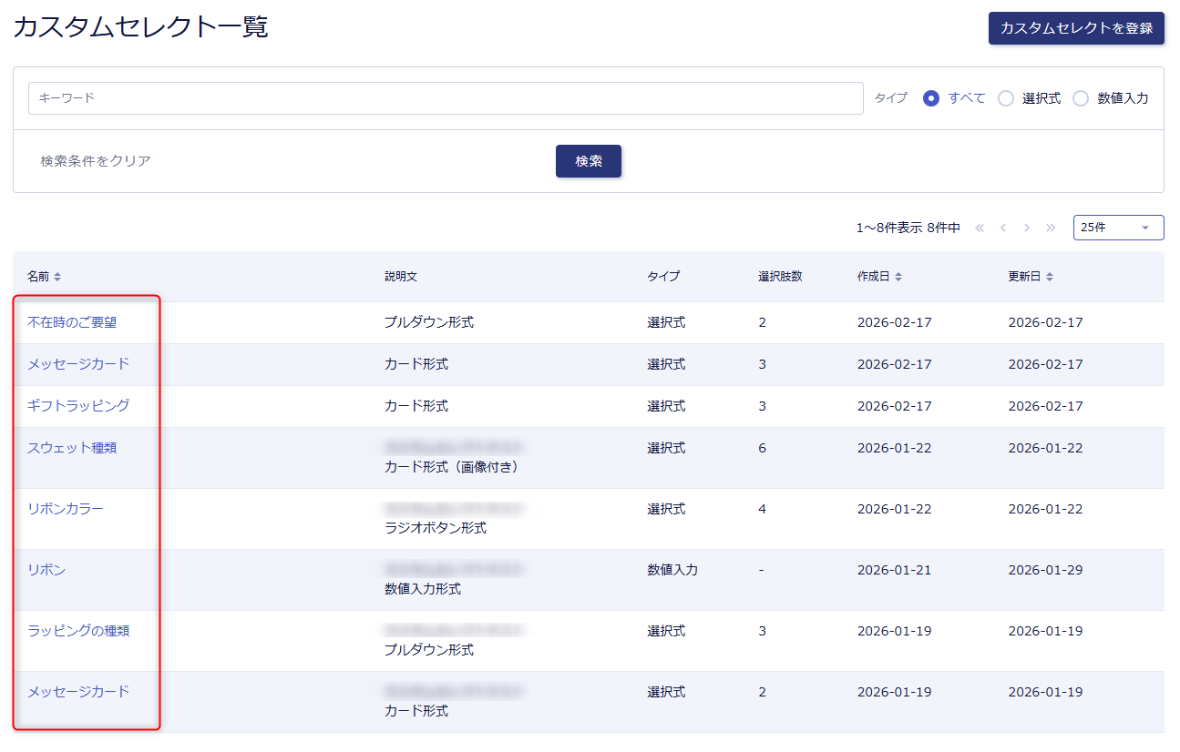 ・商品管理 / 機能・設定 / カスタムセレクト・登録・編集