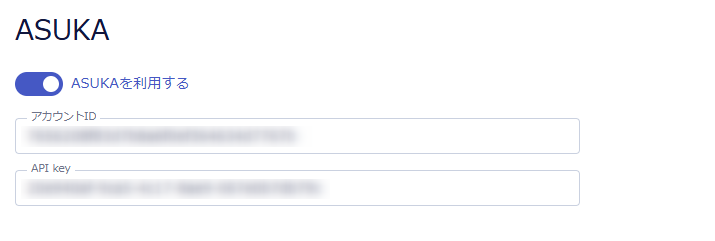 「ASUKAを利用する」をONにすると、アカウントIDなどの入力欄が表示されます。