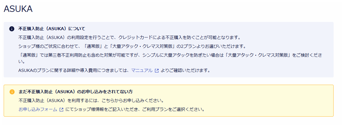 2026/4/1(水)15時以降に、クレジットカードの第三者不正利用や大量アタックなどを防ぐ「ASUKA」の設定画面をリニューアルいたします。
