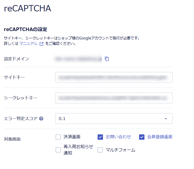 ショップ構築 / 設定 / 通知・不正アクセス対策 / 不正アクセス対策 / reCAPTCHA