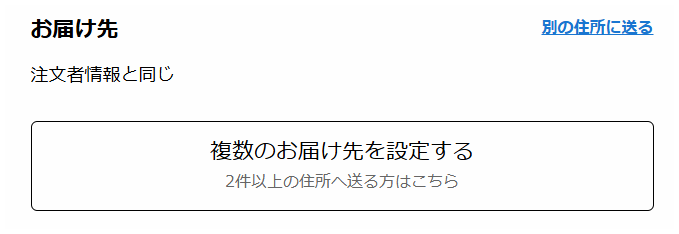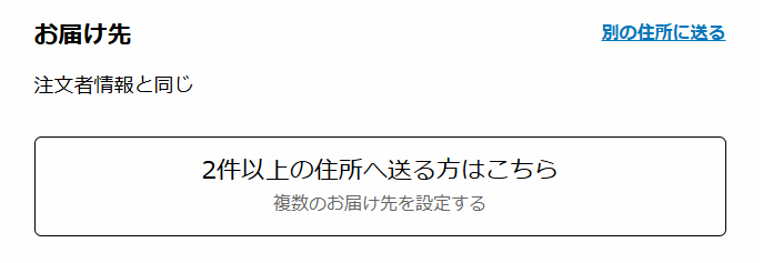 注文時によりわかりやすい導線とするため、決済画面内の複数配送用ボタン内にて、「2件以上の住所へ送る方はこちら」と「複数のお届け先を設定する」の位置を入れ替えました。
